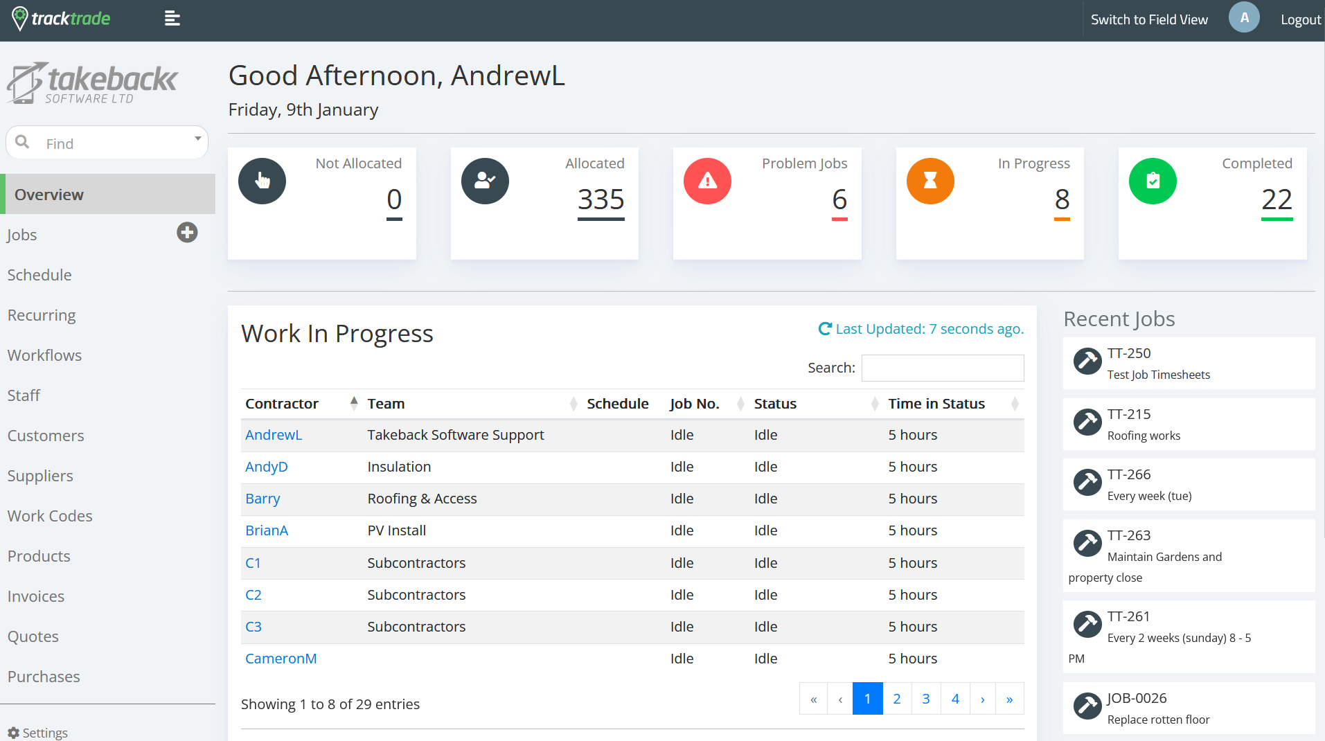 At any point you can also click the 'Switch to Field View' option at the top right. Field Staff (your workers/contractors) can also login to TrackTrade but they have a different and more focused view so it's valuable to let you see what they see at any point!