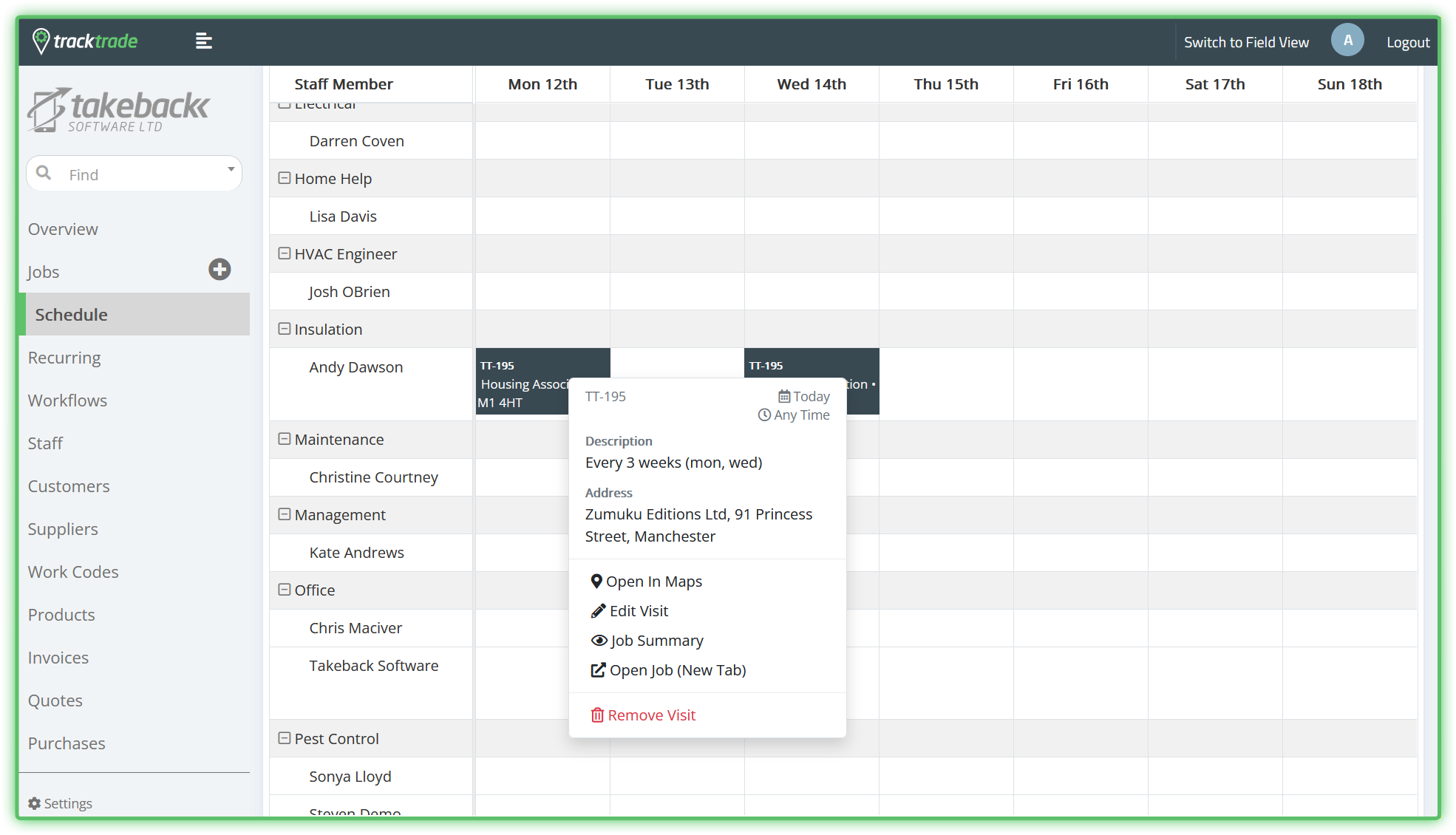 The Schedule is a calendar showing Job Visits currently booked. New Job Visits can also be booked directly from here.