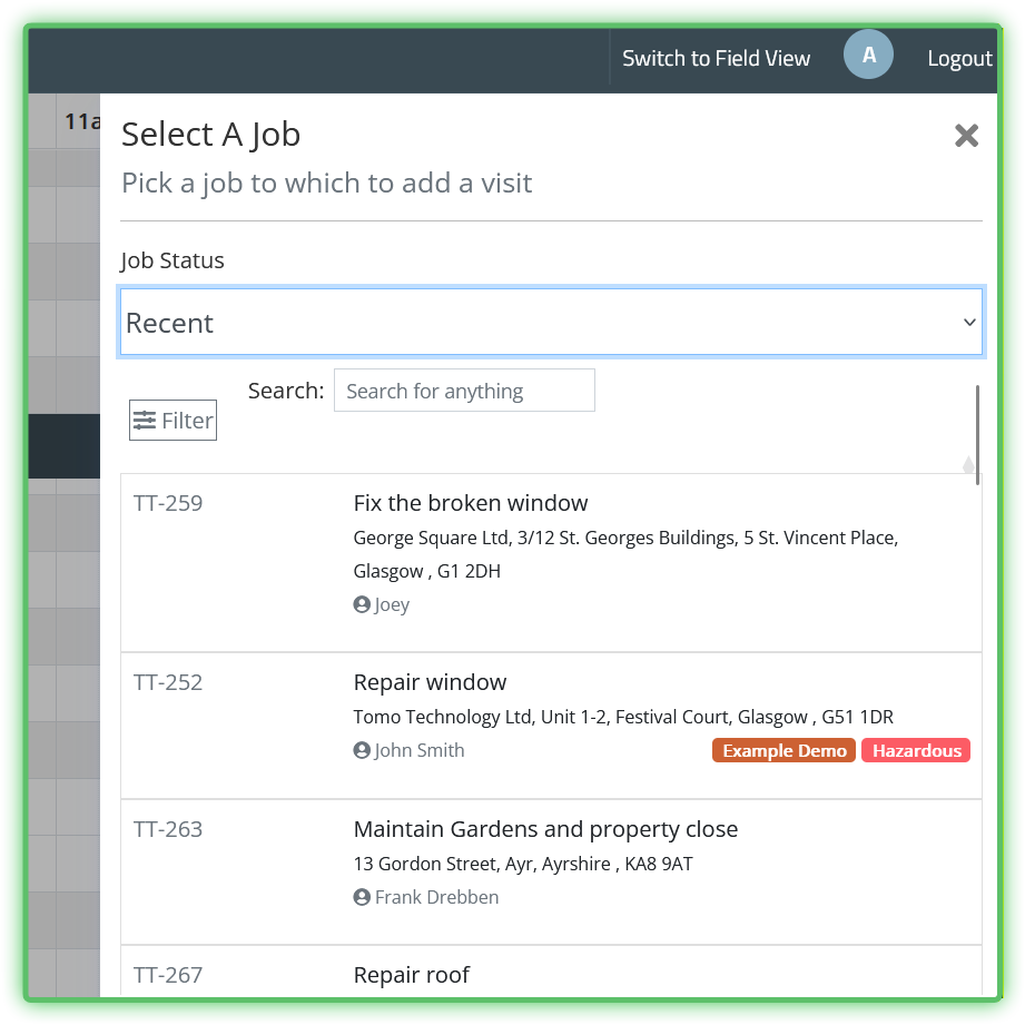 Each Job can be clicked and dragged directly into the schedule to quickly create a Visit for them.