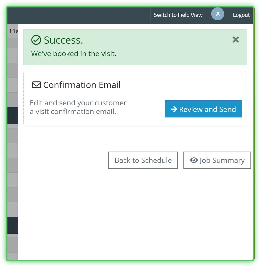 Upon booking the Visit, you'll get a confirmation for yourself and be given the option to send a notifying email to the Customer about this Visit.