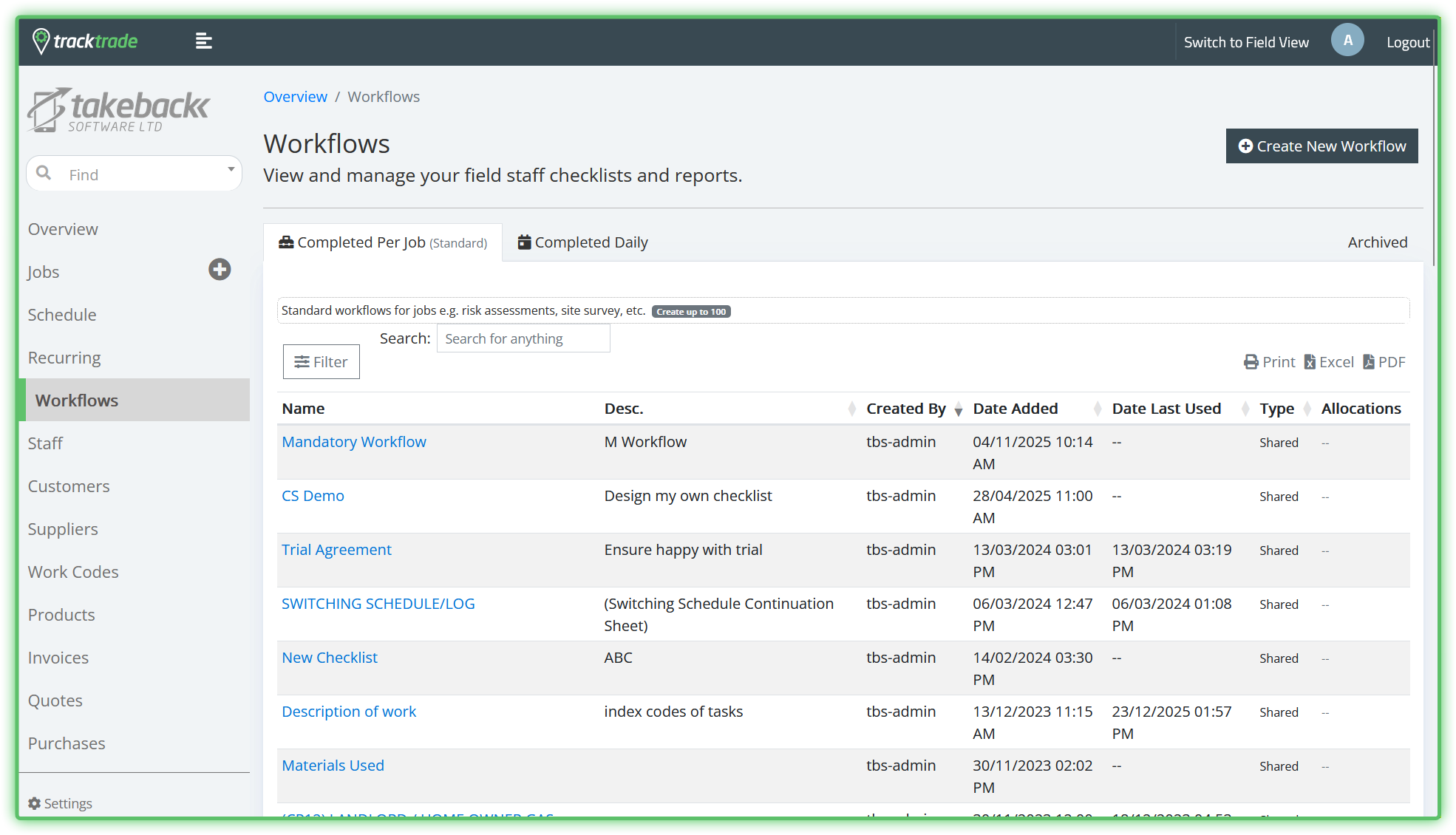 Completed Daily - These Workflows are NOT associated with a specific Job. Once created, these Workflows are available to chosen Field Staff in the Daily Checklists section of their app.