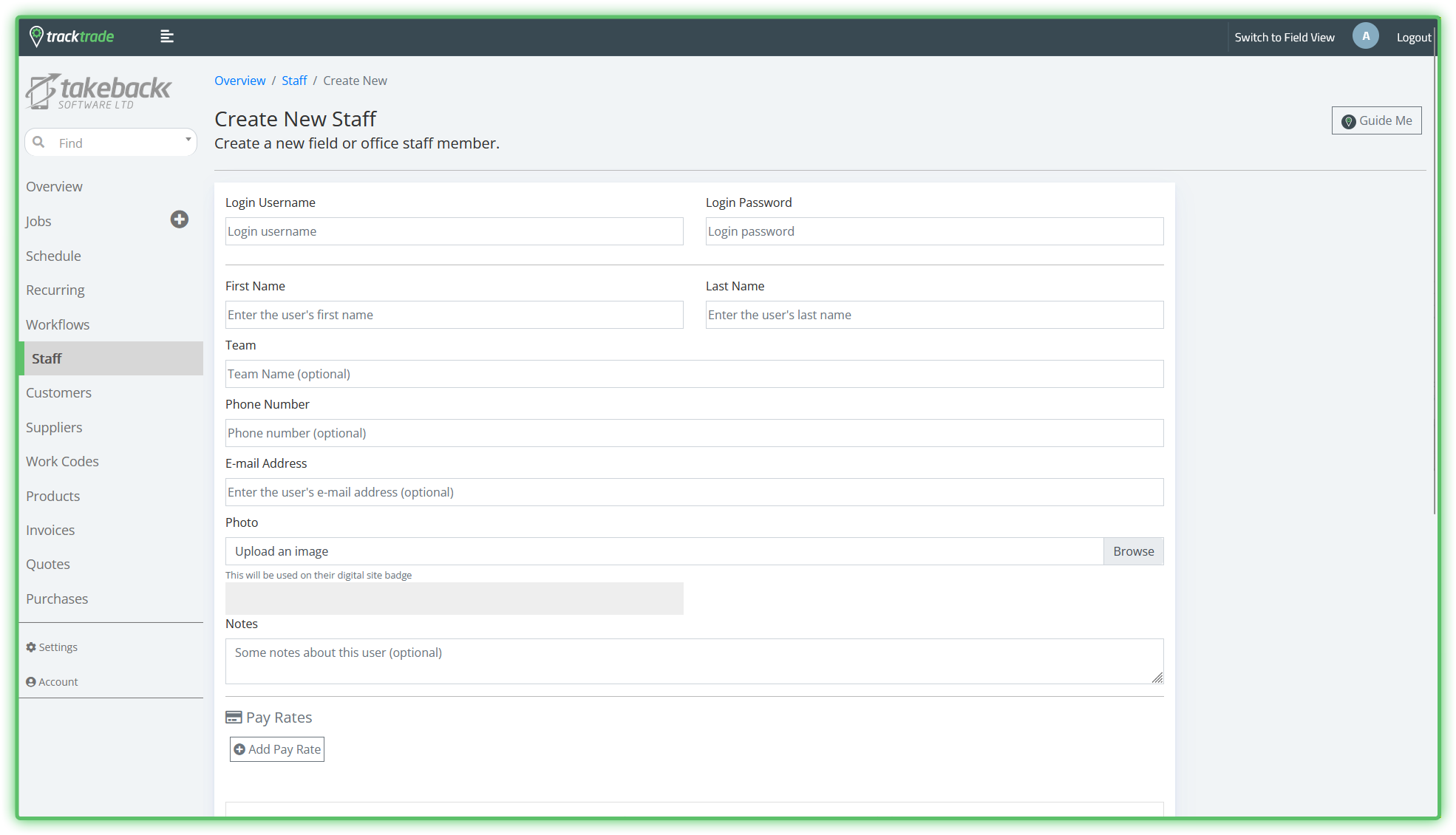 Admin Rights - Toggles between Field and Office Staff account type. Office Staff have full admin access as you likely do now (you wouldn't have access to this page without it!). Field Staff do not have full admin rights and have a more focused view allowing them to only view and work Jobs assigned to them.