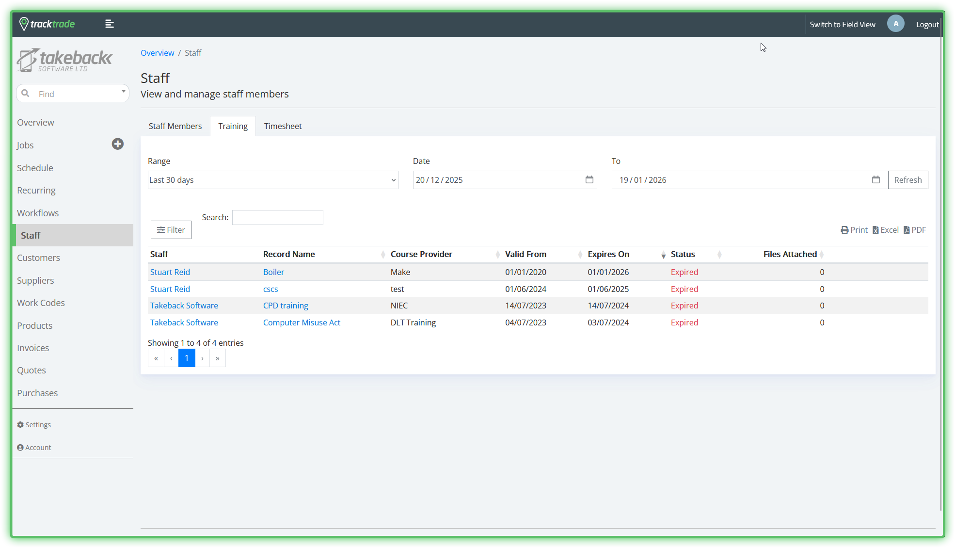 A table showing all Training courses that your Staff have taken part in. Defaults to showing the last 30 days but this can be changed with the Range options. Also supports filter, search and export options.