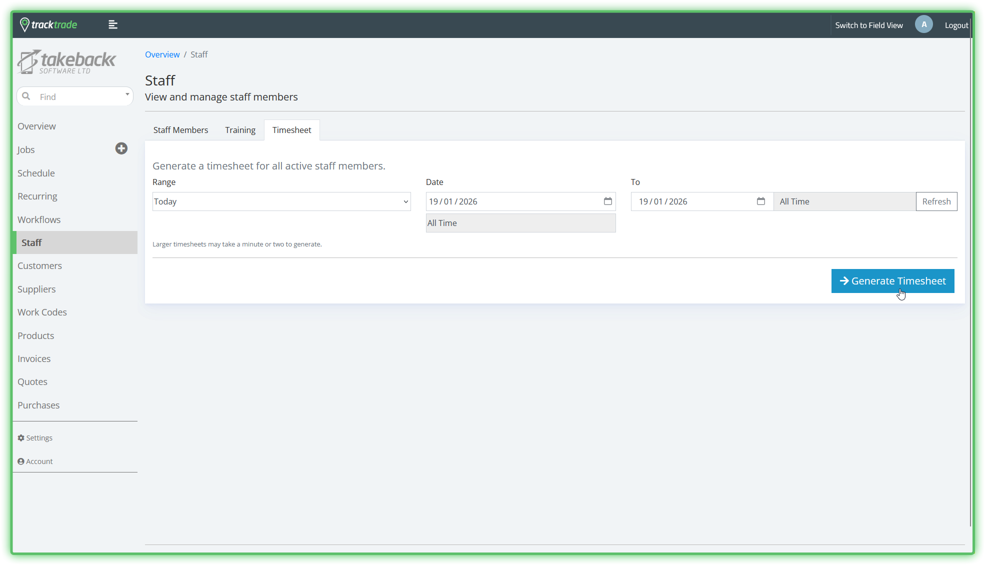 Allows for generating a Timesheet in Excel format for all active Staff in a chosen time period.