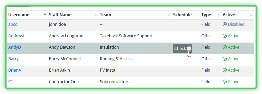 Active - Staff can be Active or Disabled.