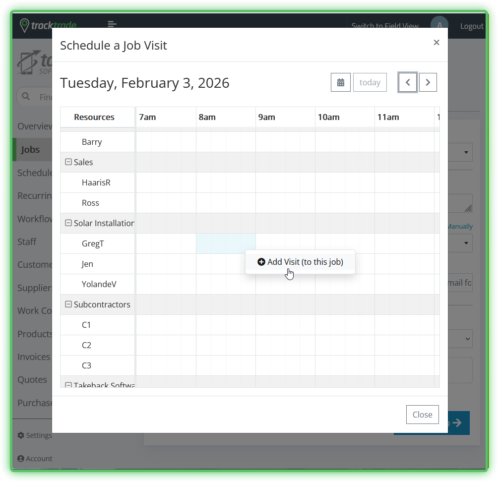 Setting the Visit attaches a time for this Job to be worked but also forces you to choose one or more Staff members to work the Job. So by doing this the Field Staff users will have the Job assigned to them and available to view on their TrackTrade app.