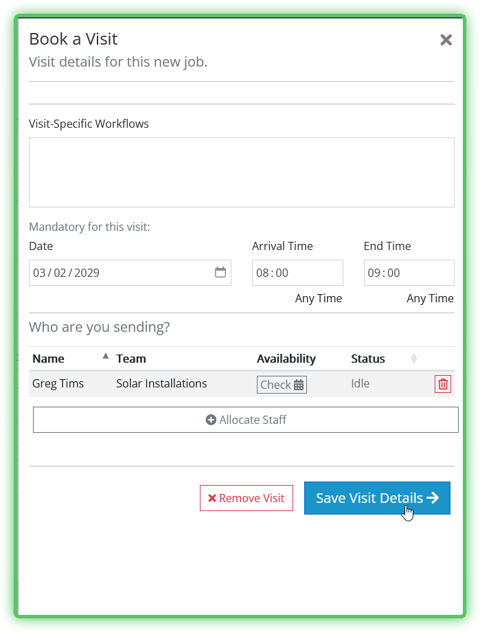 We aren't concerned with Workflows right now so ignore that section. Check the selected Staff and times are what you want and then hit Save Visit Details. You can now go ahead and hit Create Job to finalise completion and be taken to the freshly created Jobs Profile page.